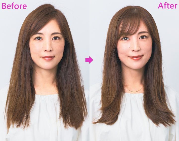 胸元レングスのロング。毛量調節でレイヤーが入っていますが、加齢によりアゴ下が広がりやすくなり、裾広がりで膨らみやすい。