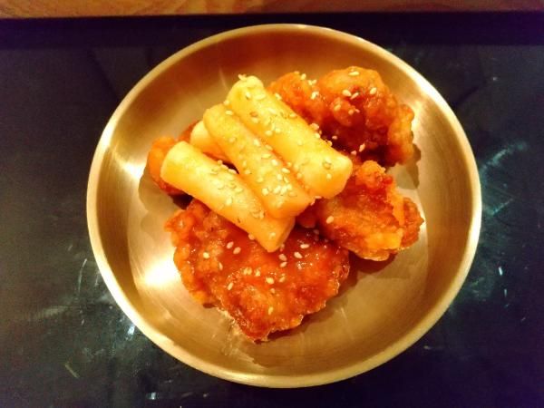 チキンの上にのってるのは揚げたトッポッキ(餅)です。チキンは醤油味。どちらも美味しい。