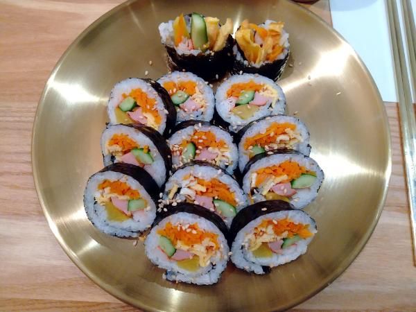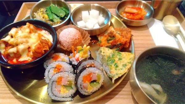 韓国料理初心者さんに絶対おすすめ。定番がそろってます。 写真は手前キンパから時計回りにチーズタッカルビ(本日の日替わり)、ナムル、大根の甘酢漬け、チヂミ、卵焼き、真ん中はチーズボール。そしてキムチとスープ。いろんな種類が食べられてお腹いっぱいになりますよ。