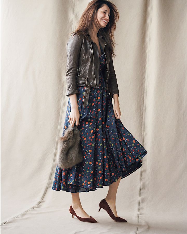 甘口な小花柄ワンピは、深みのある色のライダースと合わせて、今っぽい甘辛MIXスタイルに。足元はヒールで女性らしく。ライダースジャケット¥90,000(ビューティフルピープル/ビューティフルピープル 銀座三越)フラワープリントワンピース[共布ベルト付き]¥31,000(マリハ/ショールーム セッション)バッグ¥13,800(ル・ベルニ/キャセリーニ)パンプス¥25,000(ツル バイ マリコ オイカワ)