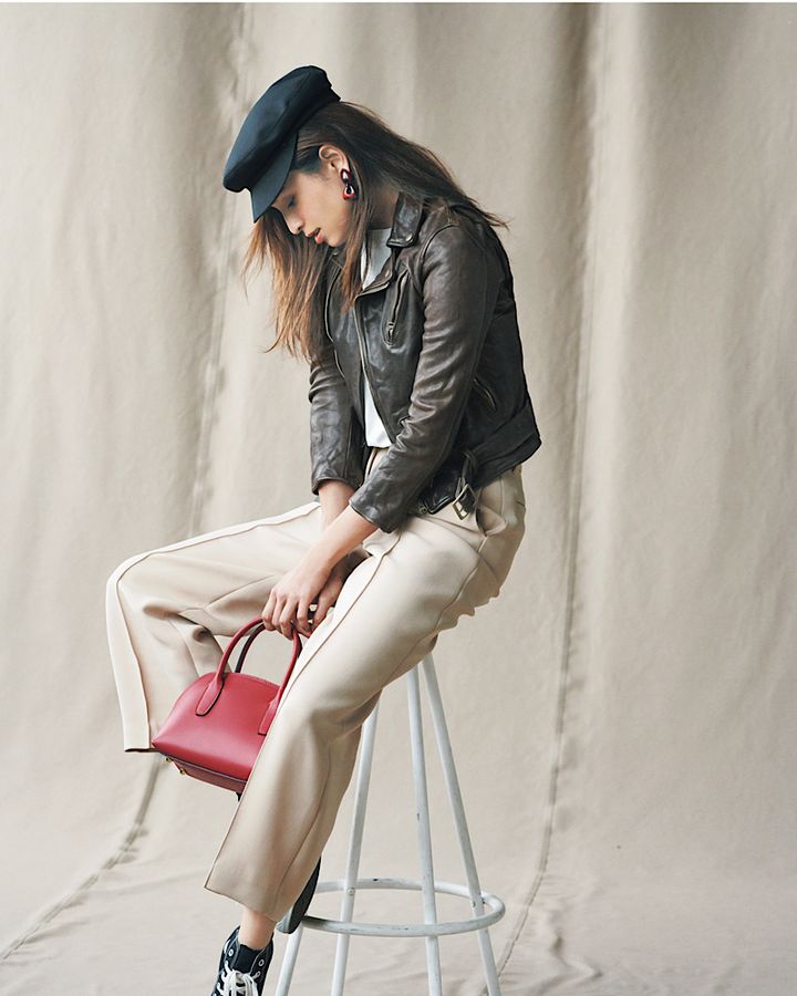 女っぽいカジュアルコーデを作るなら、ベースをベージュでまとめるのが正解です。キリッとしたライダースを合わせても、ほどよい甘さが残ります。ライダースジャケット¥90,000(ビューティフルピープル/ビューティフルピープル 銀座三越)Tシャツ¥10,000(ロンハーマン/ロンハーマン)パンツ¥17,000(デミルクス ビームス/デミルクス ビームス 新宿)マリン キャスケット¥11,000(CA4LA/CA4LA ショールー ム)バッグ¥17,000(メゾン ヴァンサン/フラッパーズ) スニーカー¥5,800(コンバース/コンバースインフォメーションセンター)イヤリング¥11,000(ドミニク・ デナイブ・パリス/アルアバイル)