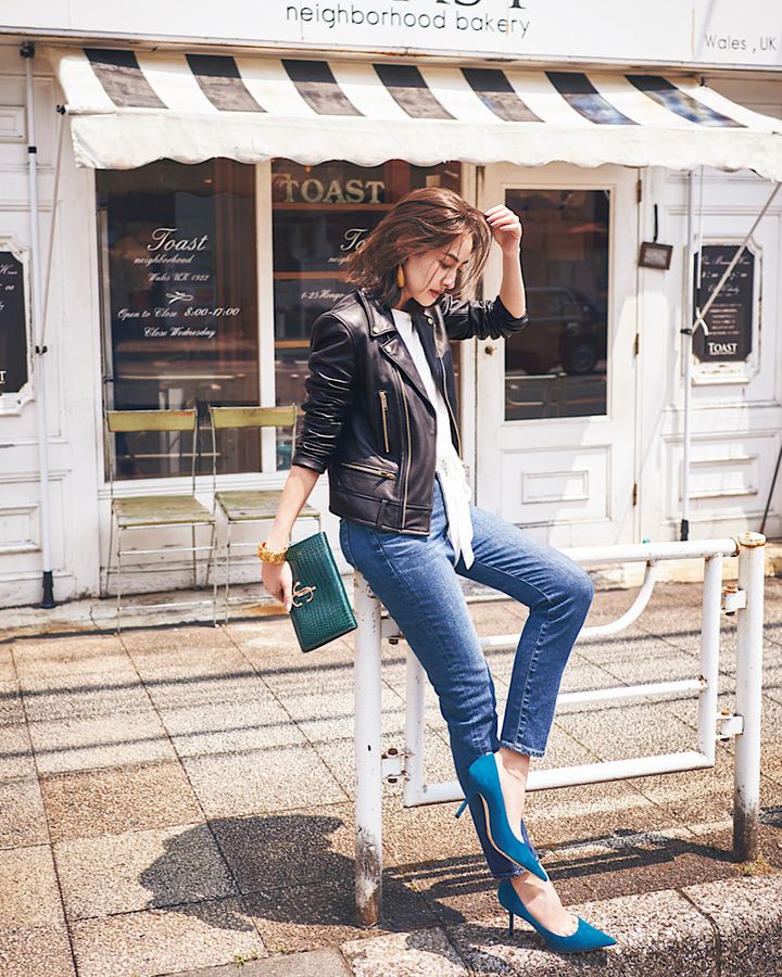 ライダース×ブルーデニムの辛口スタイルは、白トップスを選ぶのが正解です。自然な抜け感が生まれて、女性らしい印象に仕上がります。デニムパンツ¥23,000(RH ヴィンテージ/ロンハーマン)ライダース ¥88,000(アッパーハイツ/ゲストリスト)T シャツ¥10,000(MACPHEE/TOMORROW LAND)バッグ¥117,000パンプス¥76,000(ともにJIMMY CHOO)イヤリング¥5,445バングル¥19,445(ともにアビステ)