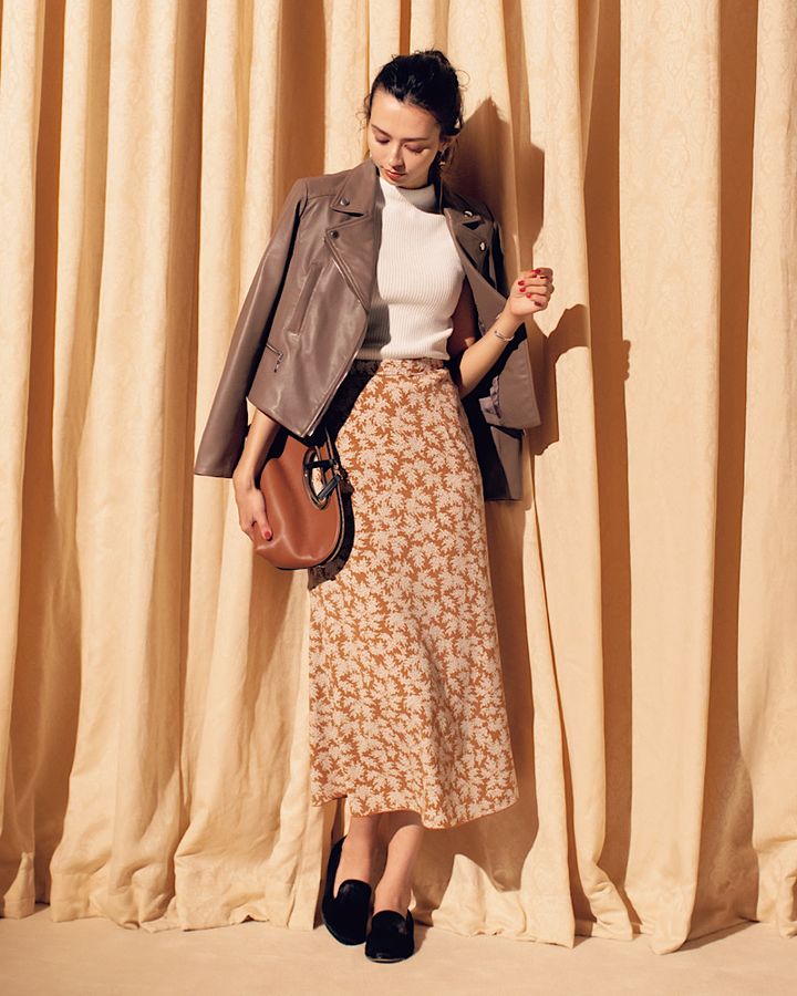 黒より茶系のライダースを選べば、優しげな女性らしさが生まれます。テロっと素材スカートで、コントラストを効かせれば、上級者見え間違いなし。スカート¥11,000(SNIDEL/SNIDELルミネ新宿2店)ライダースジャケット¥59,000(PINKY&DIANNE)カットソー ¥6,400(FRAY I.D/FRAY I.D ルミネ新宿2店)バッグ¥44,000〈ペリーコ〉シューズ¥69,000〈EST NATION×PELLICO〉(ともにアマン)ピアス¥ 21,000(シンパシー オブ ソウル スタイル/フラッパーズ)バングル¥10,000(フィリップ オーディベール/ジャーナル スタンダード 表参道)