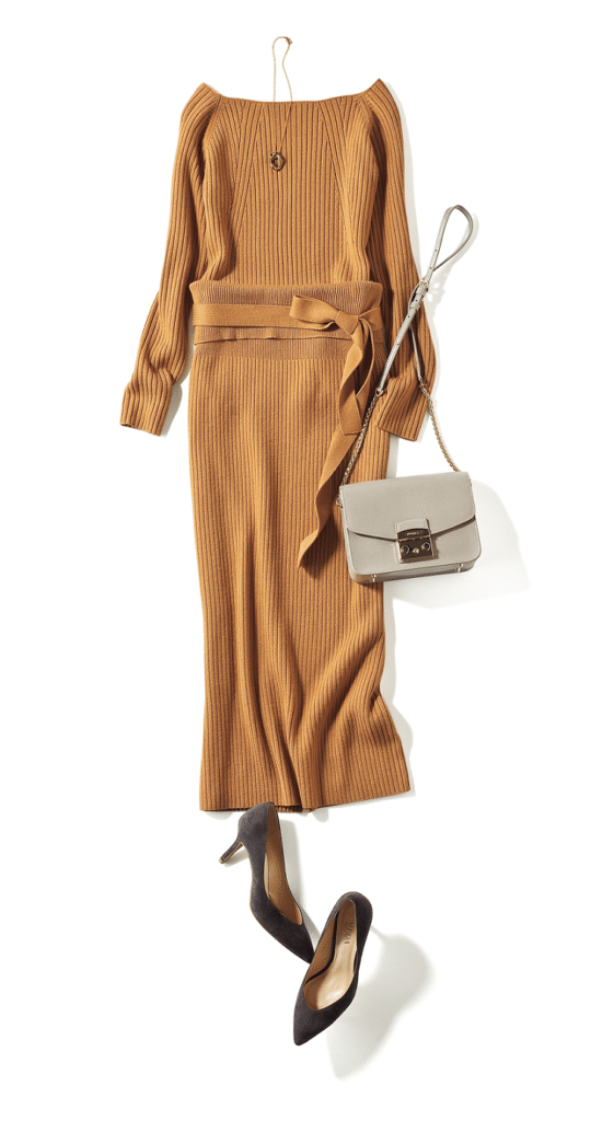適度なフィット感と、肩とデコルテが少しだけのぞくちょうどいいオフショルも大人ならではのモテ要素に。ニット¥17,000 スカート¥19,000(ともにティアラ) ネックレス¥26,000(ラウラ・ロンバルディ/アルアバイル) パンプス¥23,000(メダ/モード・エ・ジャコモ) バッグ¥48,000(FURLA JAPAN)