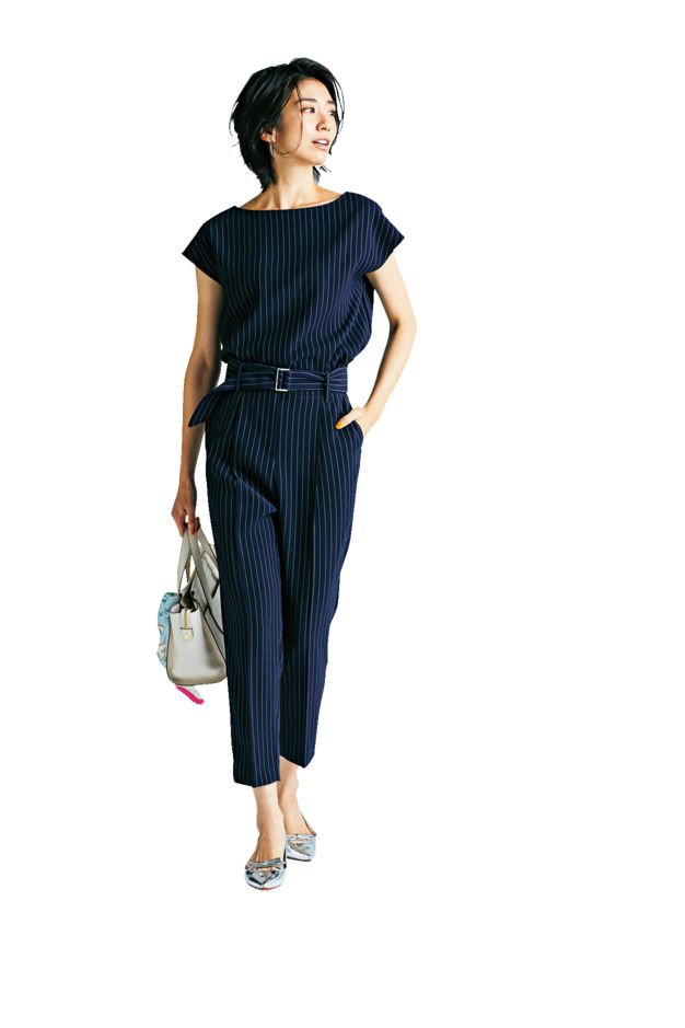 ストライプブラウス¥5,990ストライプパンツ¥7,990(ともにPLST)バッグ¥34,000(アタオ/スタジオアタオ)スカーフ¥11,000(マニプリ/フラッパーズ)パンプス¥24,000(ツル バイ マリコ オイカワ)ピアス¥2,600(ステラハリウッド)