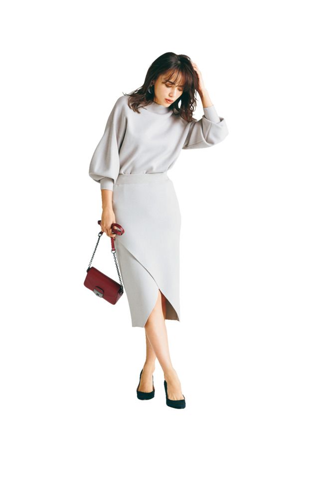 ニット¥19,000スカート¥16,000(ともにアルアバイル)バッグ¥34,500(フリン/CPR TOKYO)パンプス¥28,000(CORSO ROMA/アイランド ショールーム)ピアス¥11,500(アビステ)