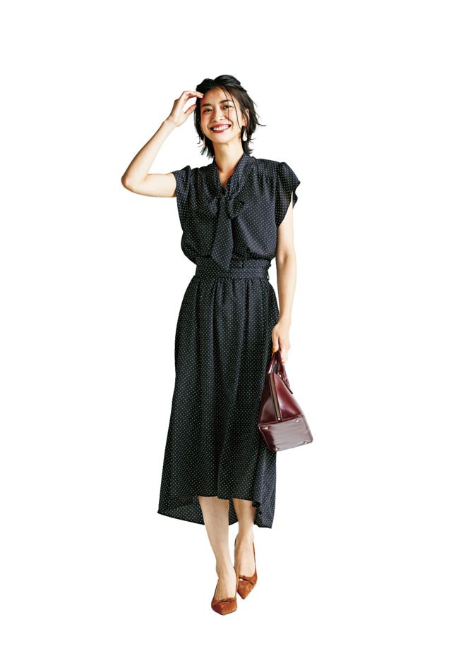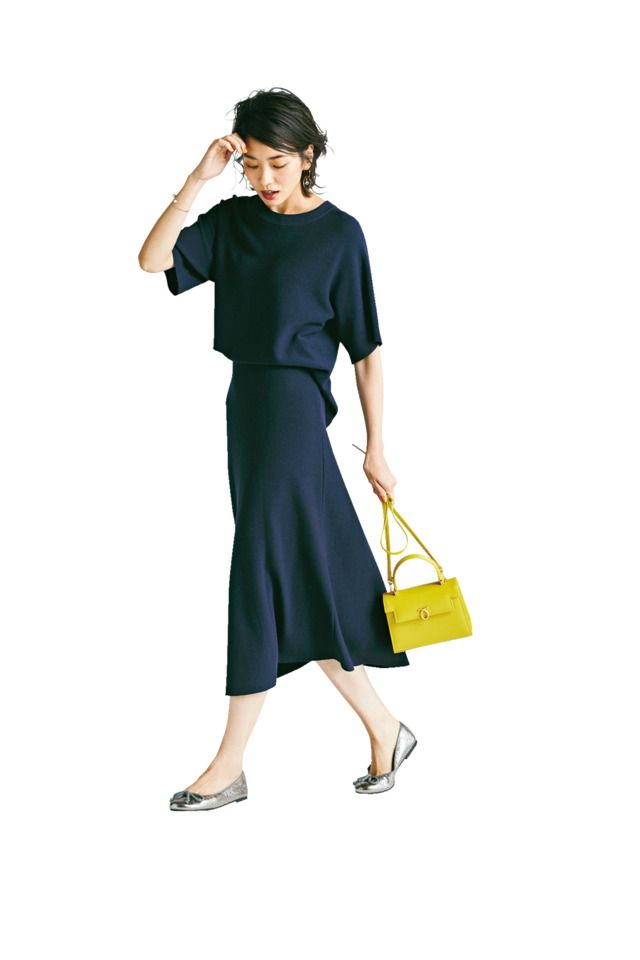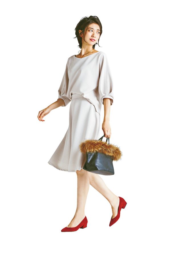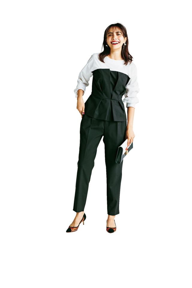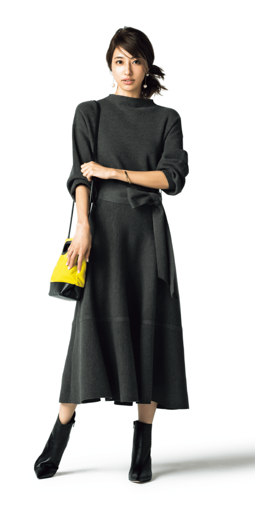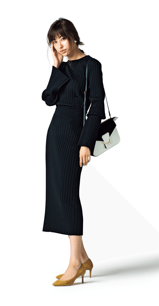 フォーマル感や地味さを回避したい黒は、リブを選んでほどよくカジュアルなニュアンスをプラスするのが正解。フレアになったトップスの袖も、グッとオシャレっぽく華やかに見えるポイントです。ニット¥32,000 スカート¥30,000(ともにハイク/ボウルズ) イヤリング¥10,000(ライツ/デミルクス ビームス 新宿) パンプス¥40,000(ロランス/ザ・グランドインク) バッグ¥20,000(LORISTELLA/メゾン イエナ)