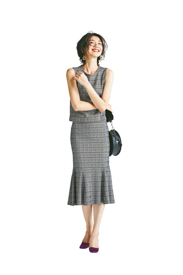 落ち着いた色はオフィスになじみやすい分、デザイン性の高いものを選んでオシャレ感をアップ。セットアップ¥14,000(Mila Owen/Mila Owen ルミネ新宿2店) イヤリング¥5,000〈アレキサンドリーヌ パリ〉ブレスレット¥44,000〈ガブリエラ アルティガス〉(ともにプラージュ 代官山店) パンプス¥42,000(ロランス/ザ・グランドインク) バッグ¥16,000(メゾン ヴァンサン×デミルクス ビームス/デミルクス ビームス 新宿)