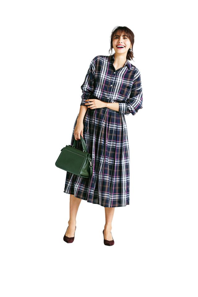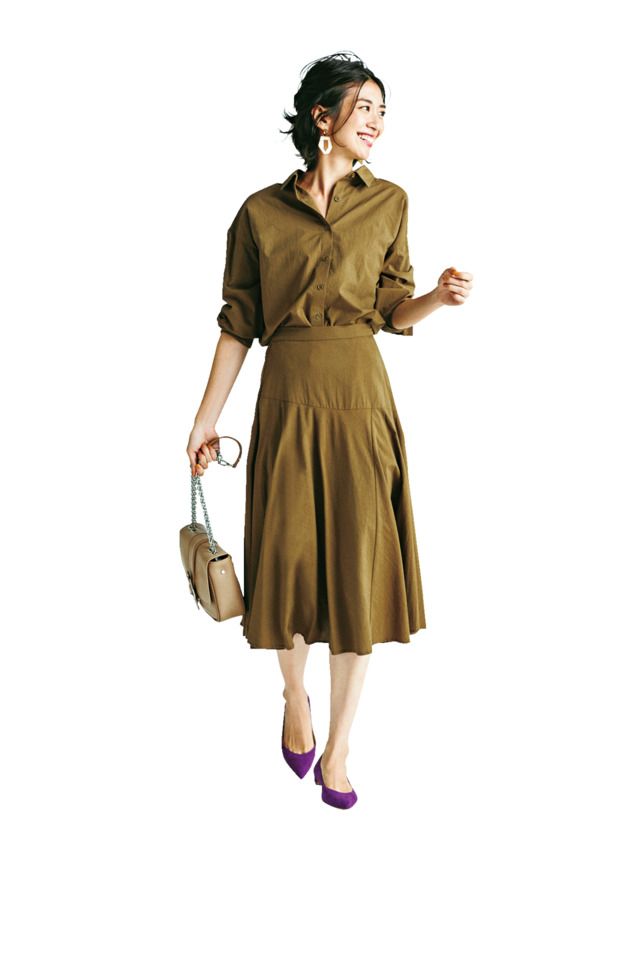 ③シャツやブラウスで品よく!“ワンピ見えセットアップ”