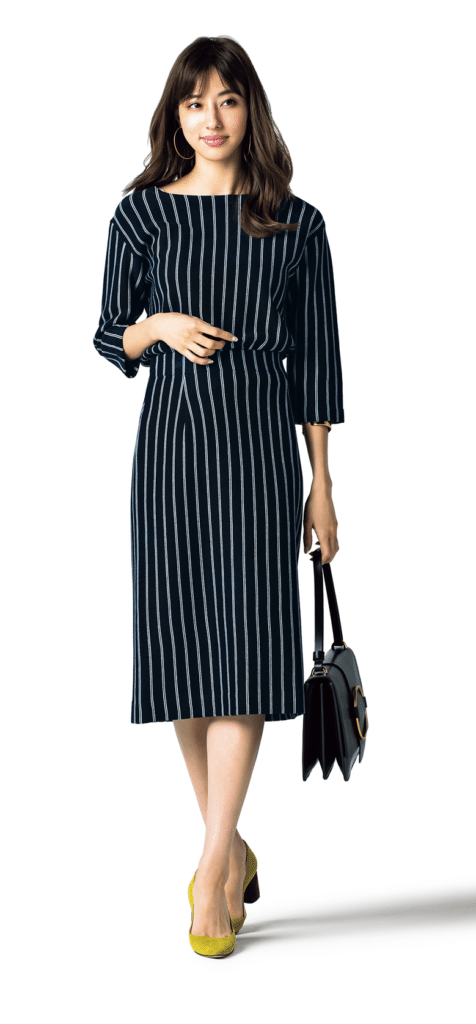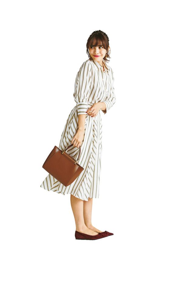 きちんと見せたいけど、ジャケットほど真面目すぎない服がいいシーンにぴったり。ストライプの知的さとハンサムなムードがデキる女感をさりげなく後押ししてくれます。ストライプの着やせ効果も嬉しい。ニット¥19,000 タイトスカート¥19,000(ともにBOSCH) バングル¥5,800(ルーニィ) ピアス¥2,980(JUICY ROCK) パンプス¥46,000(ペリーコ/アマン) バッグ¥32,000(リアヌマ/オデット エ オディール 新宿店)