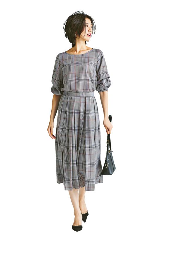 ブラウス¥19,000スカート¥20,000(ともにBOSCH)バッグ¥29,000(モダルー/ティースクエア プレスルーム)パンプス¥19,000(タラントン by ダイアナ/ダイアナ 銀座本店)ピアス¥5,500(アビステ)