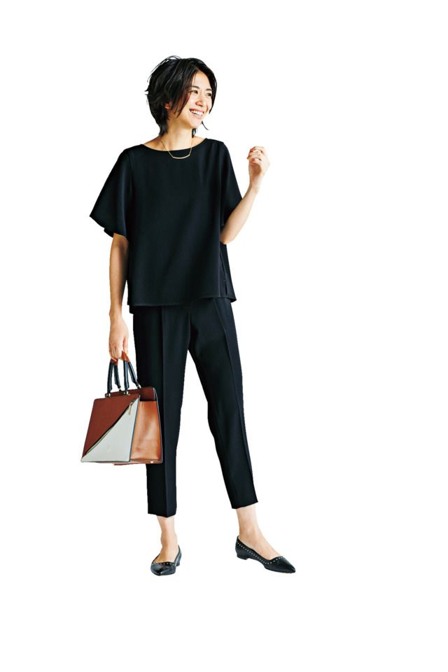 ブラウス¥36,000パンツ¥37,000(ともにYOKO CHAN)バッグ¥38,000(トフ アンド ロードストーン/T&L)パンプス¥26,000(ツル バイ マリコオイカワ)ピアス¥9,723(アビステ)