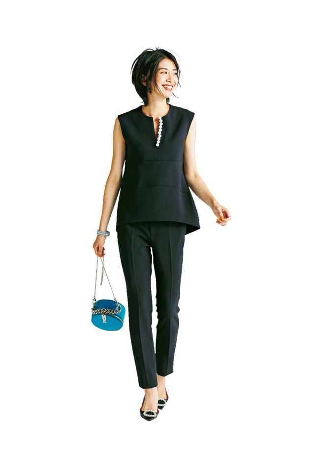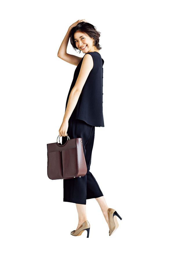 ノースリーブブラウス¥15,000パンツ¥15,000(ともにデミルクス ビームス/デミルクス ビームス 新宿)バッグ¥23,000(メゾン ヴァンサン/フラッパーズ)パンプス¥52,000(ペリーコ/アマン)ピアス¥12,000(アビステ)
