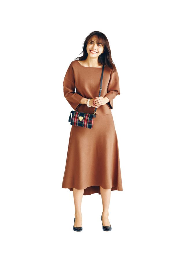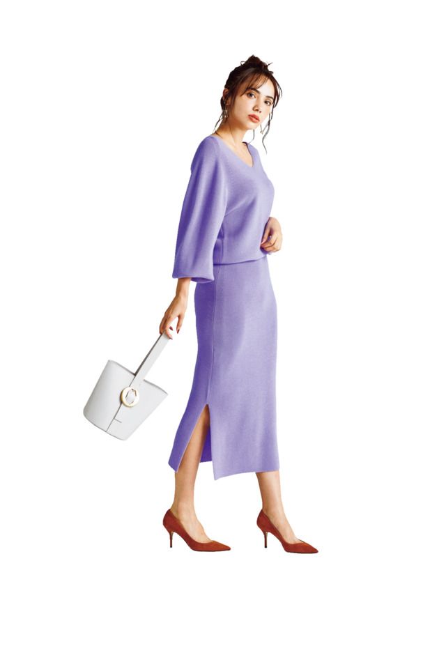 ニット&スカート[セット価格]¥17,000(バンヤードストーム/エレメントルールカスタマーサービス)バッグ¥274,000(ロウナー ロンドン/エイチ アイ ティー)パンプス¥28,000(プリティ・バレリーナ/F.E.N.)ピアス¥17,500バングル¥19,000(ともにナチュラリ ジュエリ/ナチュラリ ジュエリ 西武渋谷店)