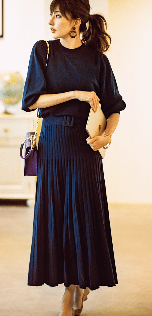 上品なネイビー×プリーツスカートのデザインが新鮮