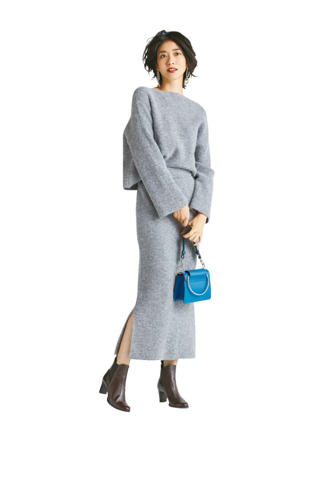 ニット¥24,000スカート¥23,000(ともにサクラ/インターリブ)バッグ¥19,800(ユナイテッド トウキョウ/ユナイテッド トウキョウ新丸ビル店)ブーツ¥27,000(オデット エオディール/オデット エ オディール 新宿店)ピアス¥3,400(ステラハリウッド)