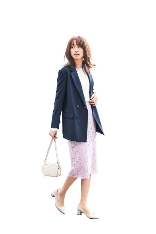 レーススカート¥25,000(PINKY & DIANNE)ジャケット¥32,000(ア ピューピル/デミルクス ビームス 新宿)カットソー¥10,000(TOMORROWLAND)カーディガン¥16,000(イエナ/メゾン イエナ)バッグ¥283,000(ヴァレクストラ/ヴァレクストラ・ジャパン)パンプス¥9,800(ル タロン グリーズ/ルタロン グリーズ ルミネ新宿店)ネックレス¥19,000(マリア ブラック/ショールーム セッション)