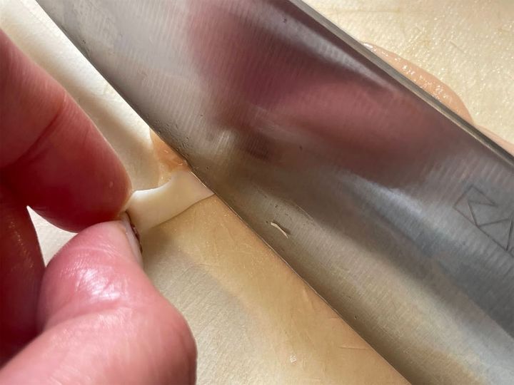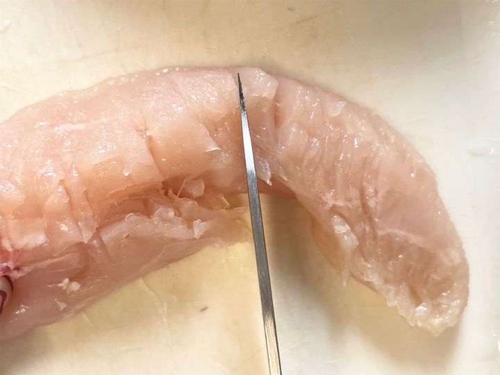 ささみを手で軽くつぶしてから、包丁の先で数か所切り込みを入れます。