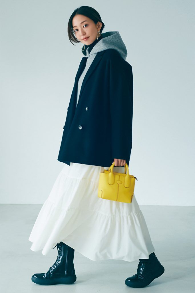 「定番のフーディですが、今年は黒タートルをINするだけできちんとした雰囲気が加わり、簡単に今年らしく見せることができます!フレアスカートに足元は辛口なブーツで、モード感を加えるのが正解」(大野さん)コート¥94,600フーディ¥35,200(ともにサクラ/インターリブ)ニット¥15,400(LE PHIL/LE PHIL NEWoMan 新宿店)スカート¥18,700(ステートオブマインド/ゲストリスト)バッグ¥261,800ブーツ¥130,900(ともにトッズ/トッズ・ジャパン)ピアス¥8,800(アビステ)