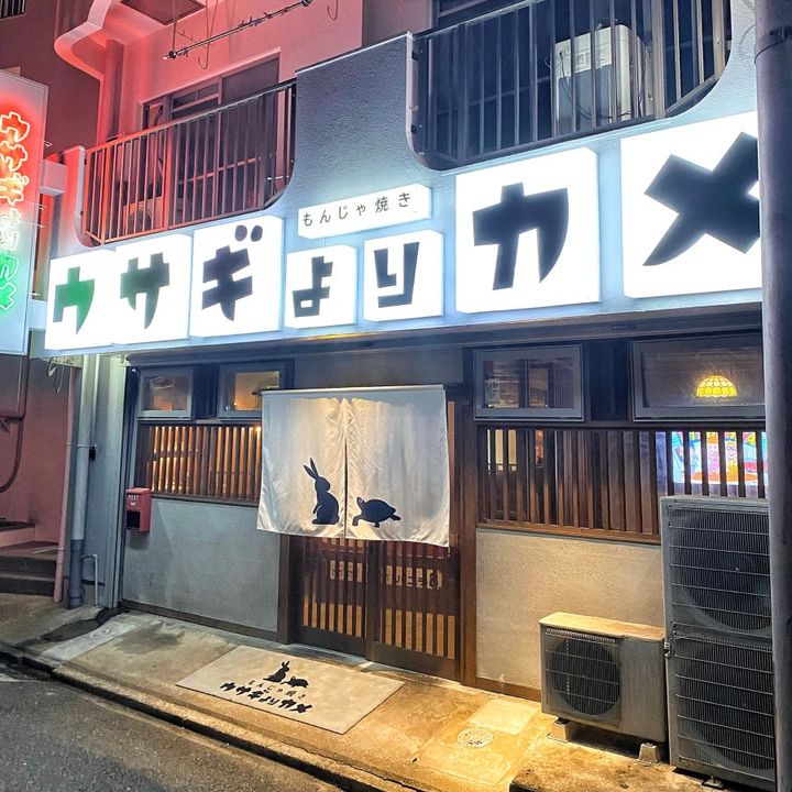 地下鉄七隈線天神南駅から徒歩約10分に位置する「ウサギよりカメ」は、もんじゃ焼や鉄板焼が楽しめる春吉エリアの人気店。だしが利いた風味豊かなもんじゃが、シンプルなものから変わり種まで10種類以上、バリエーション豊富に用意されています。