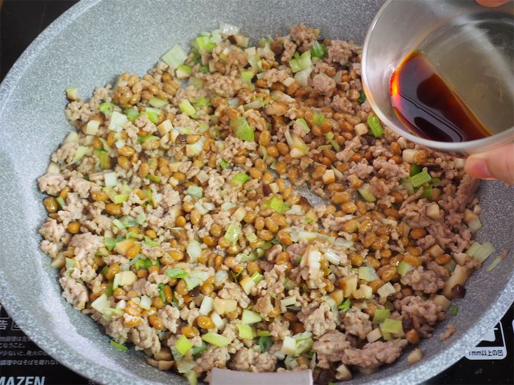 5. 4に納豆を加えひと炒めしたら、しょうゆ、こしょうを入れ混ぜる。