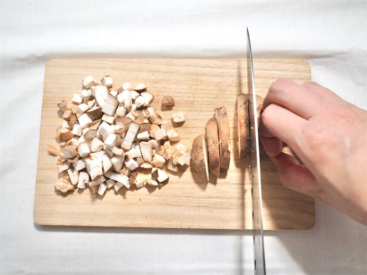 1. しいたけの石づきを切り落とし、みじん切りにする。