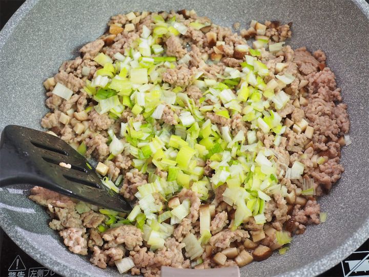 4. 豚ひき肉の色が変わったら、1を加えて軽く炒め、さらに2を入れさっと炒める。