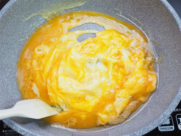 8. フライパンにこめ油を入れ強火にかけ、温まったら7を入れ、大きく混ぜるようにして半熟状に火を通す。
