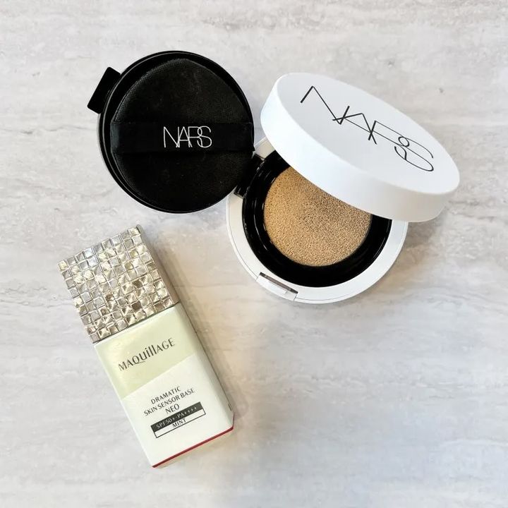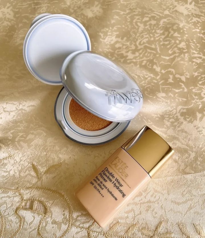 どちらもSPF50配合で日焼け止め対策バッチリ。エスティローダーのプライマーは伸びが良くサラッと肌に溶け込み、fweeのクッションファンデは薄づきなのにしっかりカバー力もあり、今っぽいツヤ肌感に仕上げてくれます。