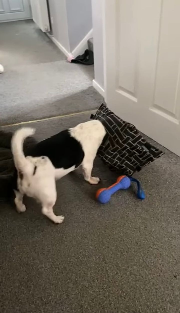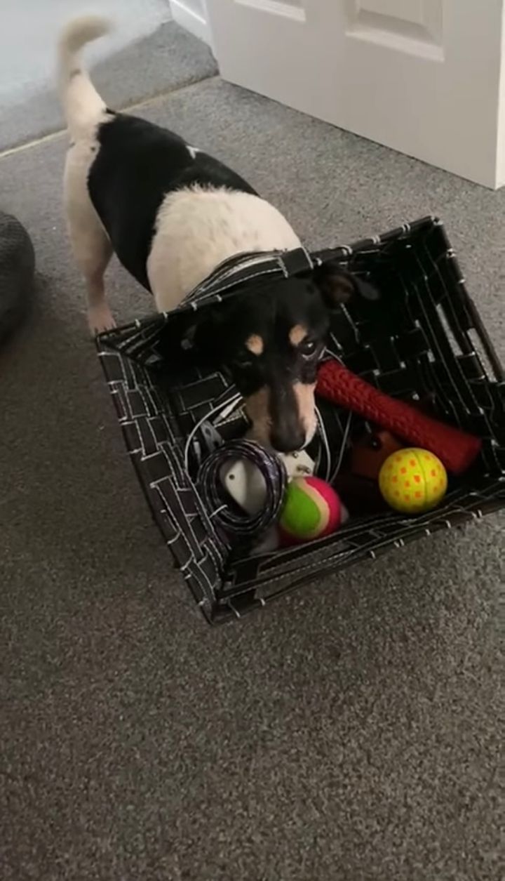 撮影者さんの愛犬がオモチャ箱を漁っていました。 ところが、なんだか様子がおかしいのです。