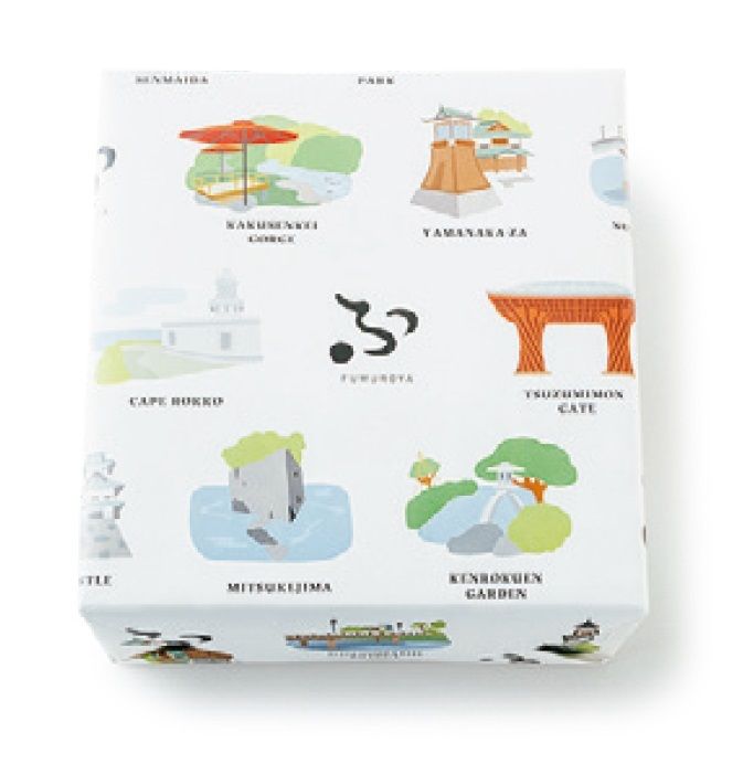 M:まずは包みに注目してください。能登の見附島や禄剛(ろっこう)崎、それに金沢の鼓門や兼六園など県内の観光名所が描かれ、郷土に想いを込めたひと品という感じがもう伝わってきます。「宝の麩」はご存じでしたか?