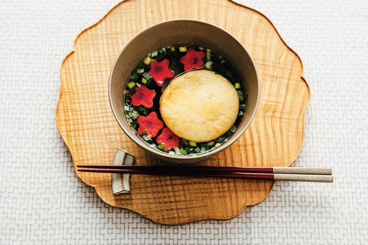 M:お椀に入れて真ん中に穴を開けてお湯を注ぐと、中から具材が湧き出るように溢れてくるんです。わかめ、湯葉、ネギに、深紅のお花は春の能登を彩る「のとキリシマツツジ」を模した加賀麩。