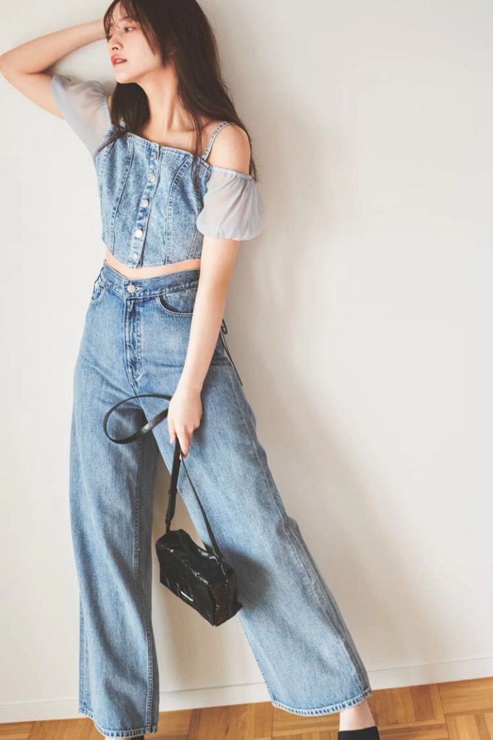 ふんわりパフスリーブとピタシルエットのメリハリに。ピタピタビスチェで女みを、デニム×デニムでミーハー感を。欲張りたいコはぜひ。