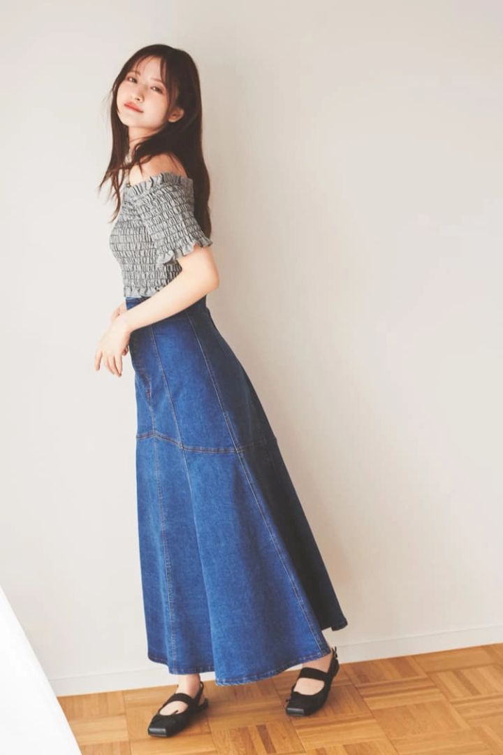 デニムマーメイドスカート 9,900円/LILLIAN CARAT(リリアン カラット)ギンガムチェックトップス 11,800円/lilLilly(lilLilly TOKYO)ブラックメッシュフラットシューズ 9,200円/チャールズ&キース(チャールズ&キース ジャパン)