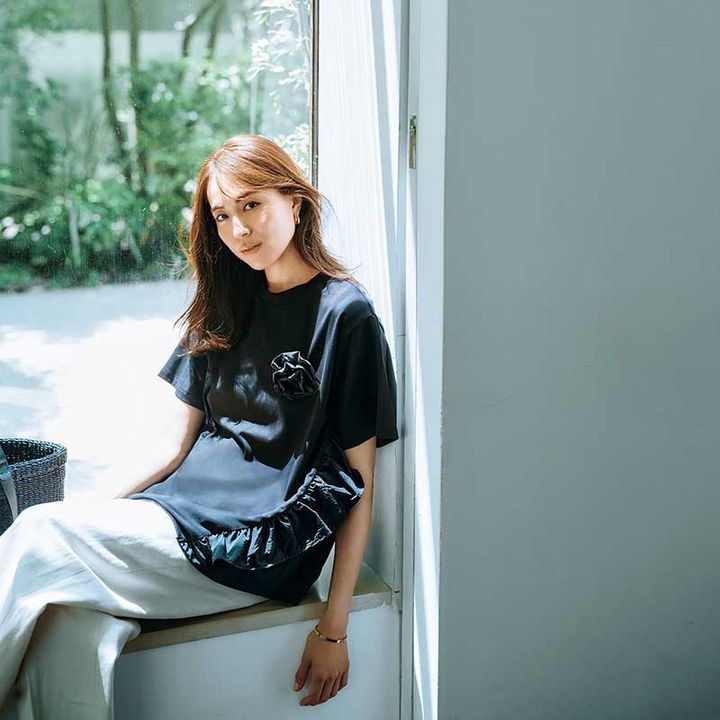 イージーパンツに合わるだけ。 コサージュ&ラッフルデザインで Tシャツコーデを更新