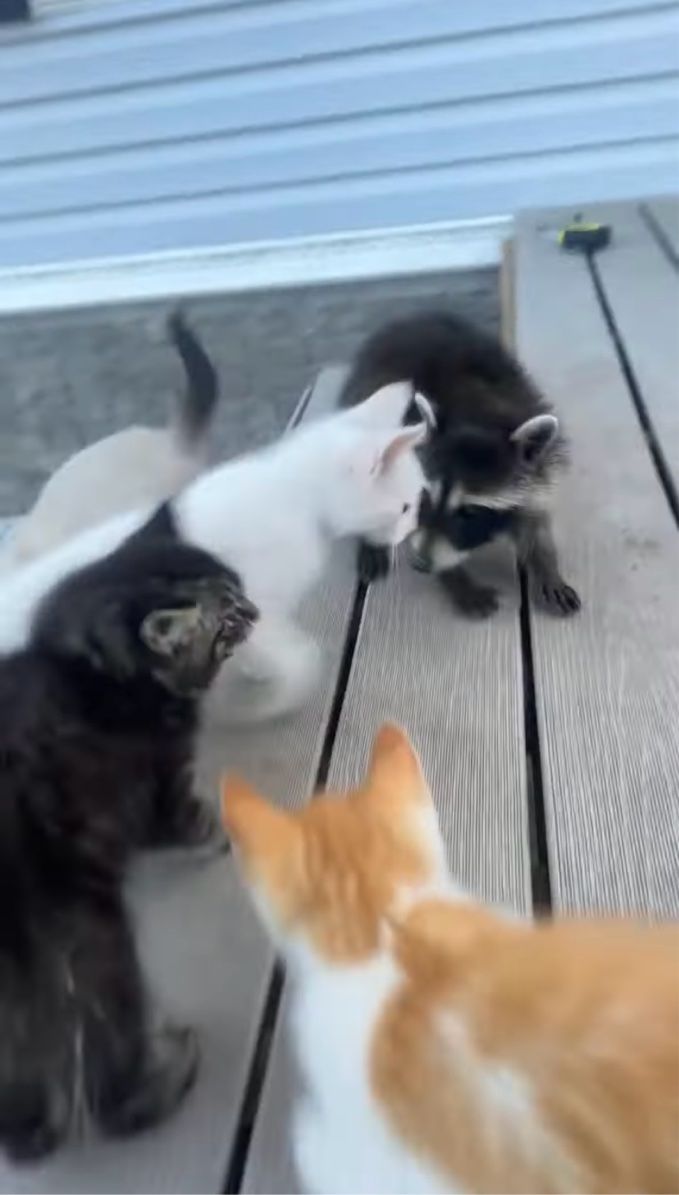 そして、アライグマの周りに子猫たちもゾロゾロと集まってきました。 もしかしたら、アライグマは子猫たちに「君はだ~れ?」なんて言われているのかもしれません。