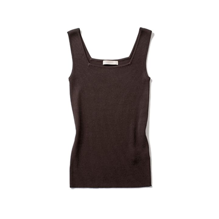 デコルテをキレイに見せるスクエアネック。後ろ開きトップスのインナーとしても活躍しそう。ニット¥4,990(アンフィーロ)