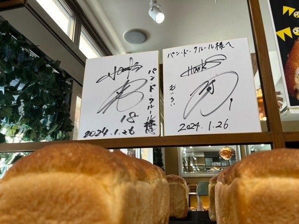 店内にはホークスの投手のサインが!「おいちい」の文字も見られます。 当時2軍だった選手たちも、今や1軍で大活躍。もしかしたらここパン・ド・クルールのパンを懐かしんでいるかもしれません!
