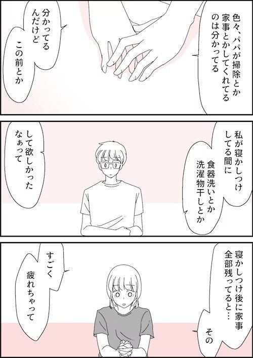 まことさんは考えていたことを素直に伝え、夫に対して抱えていたモヤモヤを吐き出しました。夫からは「自分も疲れていてもやっていることがある」「なぜ自分が責められるの」など、思っていたことがそのまま返ってきました。