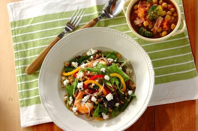 栄養豊富で食物繊維が豊富な「タイガーナッツ」を使った、ダイエット中でも食べ応えがあるサラダの献立です。副菜にはホクホク食感のヒヨコ豆のスープをセレクト。最後に加えたバルサミコ酢が味のポイントです。