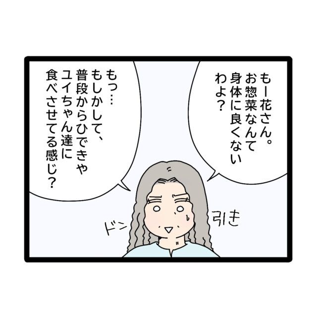 すると、夕飯作りを花さんに振っておきながら「お惣菜なんてからだに良くないわよ?」と義母はドン引き。さらには「もしかして、普段からひできやユイちゃんたちに食べさせてる感じ?」と息子と孫の心配をし始める始末。