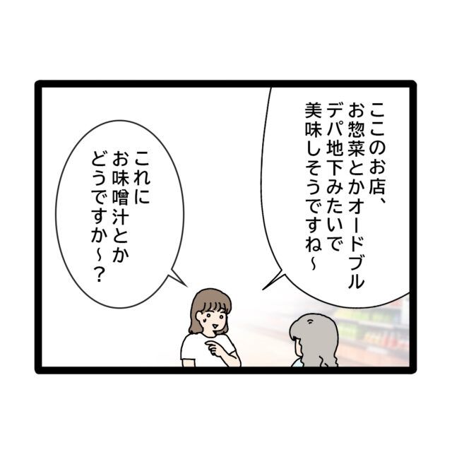 夕飯を作ることを義母に当然のように言われ、長旅で疲れている花さんは、スーパーを見回すとお惣菜コーナーが目に入ったので「お惣菜とかオードブル、デパ地下みたいで美味しそうですね。これにお味噌汁とかどうですか~?」と聞いてみました。