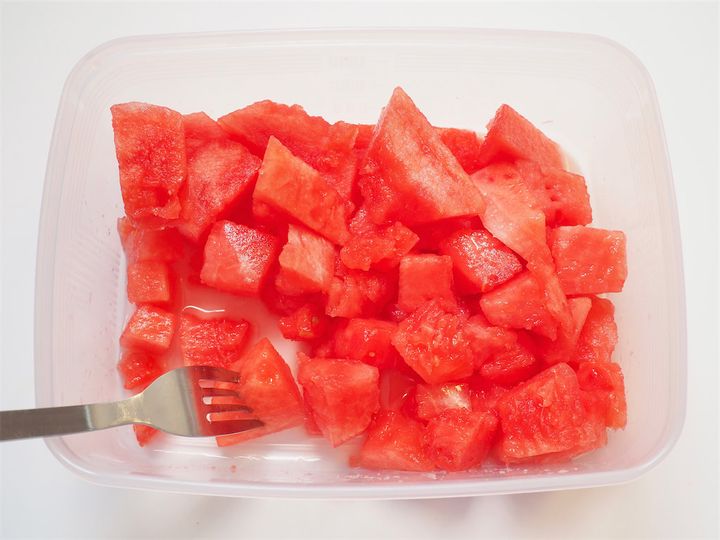 2. バットなどに広げ、フォークでスイカを小さめに潰し、出た汁ごと冷凍庫で約1時間凍らせる。