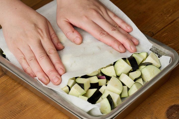水をはったボールに入れて5分ほどさらす。ざるに上げ、ペーパータオルで上下からはさみ、水けをしっかりと拭き取る。