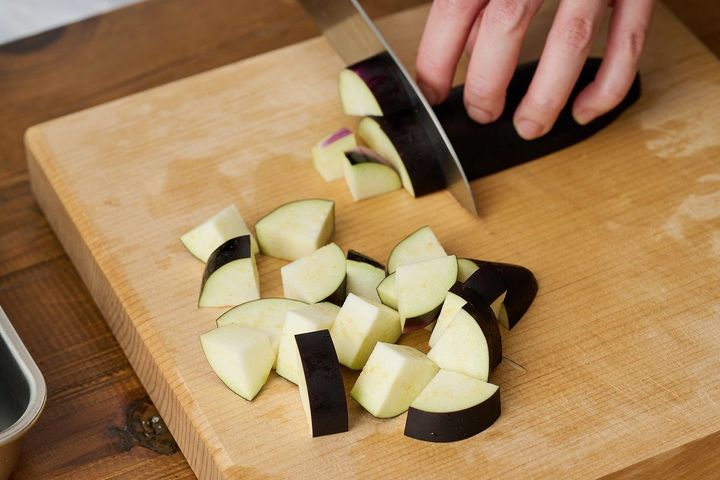 (1)なすはへたを切り落とし、幅1cmのいちょう切りにする。