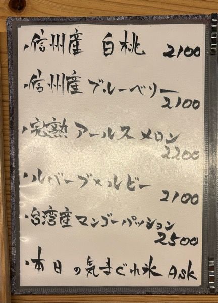 「本日の気まぐれ氷」は「プラムブレンド」でした。 本店が信州ということもあり、信州産のものを中心に旬の果物が並びます。 迷いに迷って「信州産白桃」2,100円と「ルバーブ×ルビー」2,100円をお願いしました。