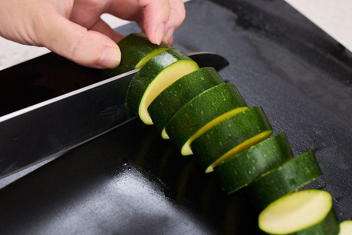 3.ズッキーニは幅1〜1.5cmの輪切りにする。
