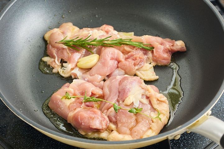 4.フライパンに(2)を漬け汁ごと入れる。鶏肉は皮目を下にし、ハーブを鶏肉の上にのせたら中火にかけ、ふたを少しずらしてのせて5分焼く。