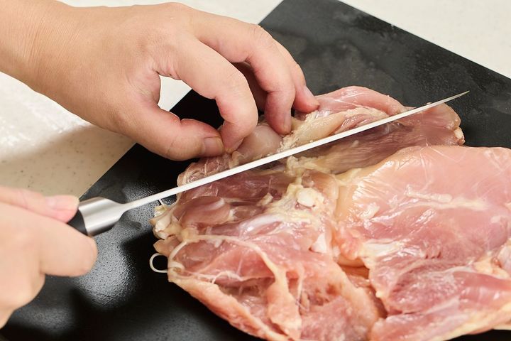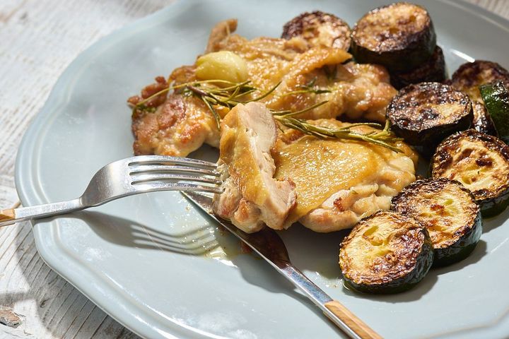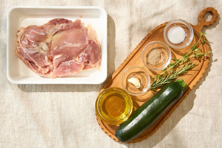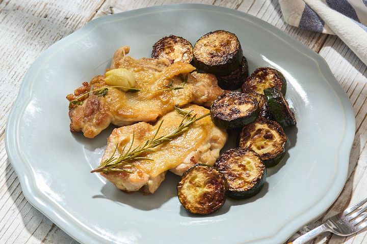 ポイントは鶏肉を観音開きにすること。身の厚さが均一になり、まんべんなくこんがり香ばしく仕上げることができます。ズッキーニがなければなすでもおいしく作れます。