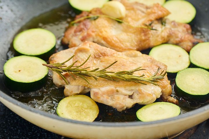 5.裏返し、再びハーブを鶏肉の上にのせる。ズッキーニを鶏肉のまわりに並べたら、ふたをして、ときどきズッキーニを裏返しながら10分焼く。